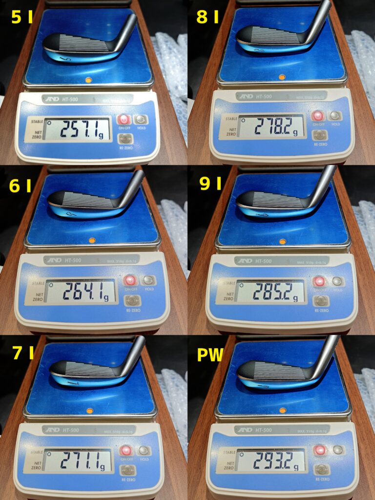 ヘッド重量は写真(上)の様に番手毎に+7gづつ等間隔フローしていくのが基本となります。近年のアイアンではPWに関して+8gとされる様になりました。(仕上りバランスの問題)