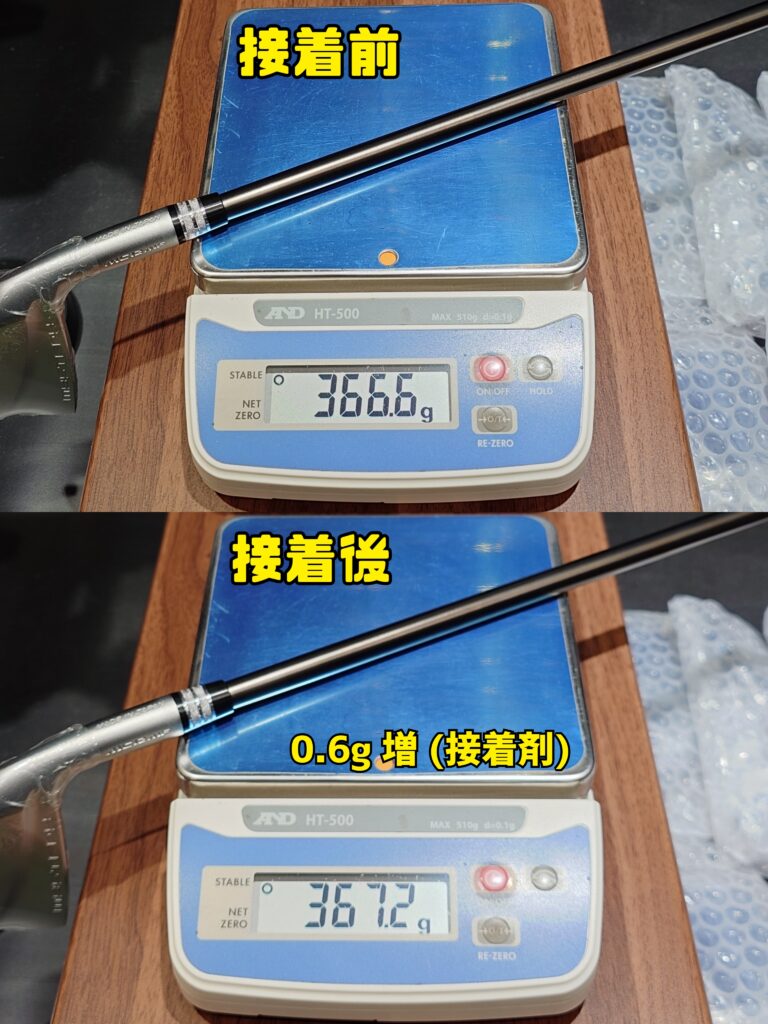 接着前の重量から接着後の重量を計測。(増量分が接着剤の重量と言う事になります) これによりバランスも+0.3ポイント程度変化して来ます。
