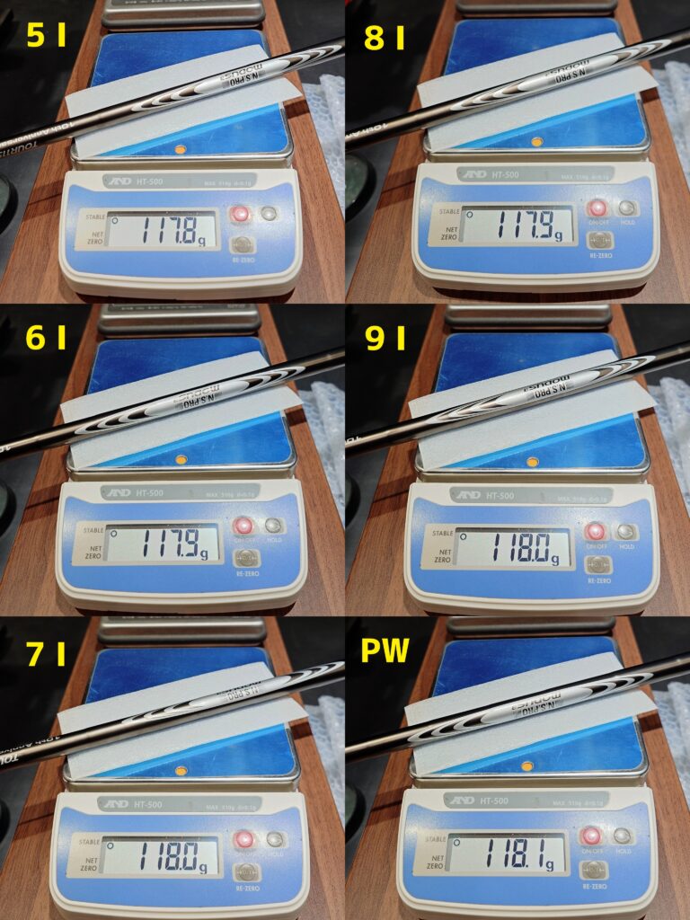 通常アイアンシャフトは番手別設計で作られており、長さが違えど全番手が同じ重量が基本です(40.0インチが100gなら37.0インチも100gと言う事です)。 先ずカット前のシャフト重量を計測します。 今回使用するシャフトは重量管理を徹底した理想的なセット(写真上)なのでヘッド重量共に公差が ±0.2g以内と完璧です。