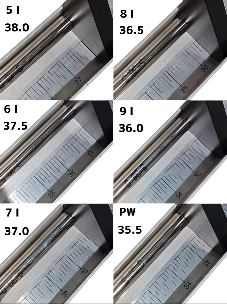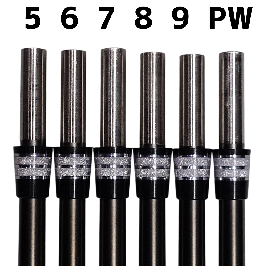 基準番手の長さが決まったら他番手は挿入長(今回のヘッドは写真上の32mm〜33.5mm)に合わせチップカット調整をしながら各番手毎の半インチ長(12.7mm)をキッチリ合わせます。ホーゼル長が長いショートアイアンになるに連れチップカット量が増え、シャフト長は短くなり重さも僅かづつ減っていきます。また7g間隔のヘッド重量であっても、8番以降はバランスが下がりやすい傾向なので、重量、バランス合わせは特に神経を使わなければなりません。
